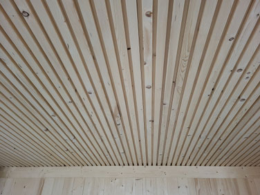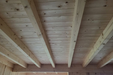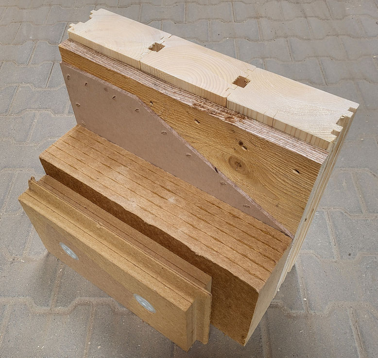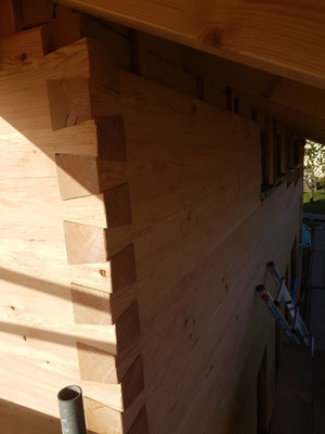 Grundlage für unsere Wände bilden 10cm dicke Balken mit doppelter Nut und Feder und integriertem Kabelkanal.